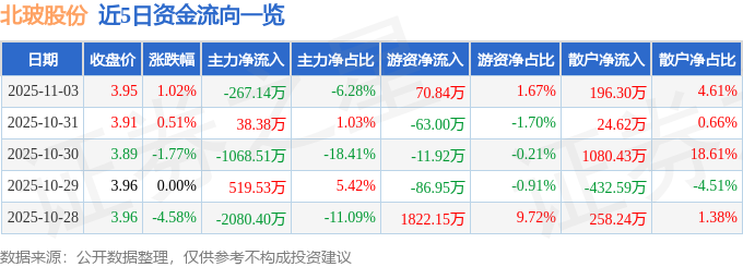 证券之星消息,截至2025年11月3日收盘,北玻股份(002613)报收于3.95元,上涨1.02%,换手率1.4%,成交量10.85万手,成交额4254.09万元。