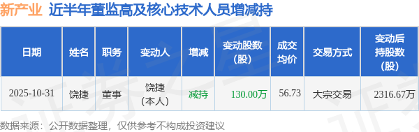 证券之星消息,根据11月3日市场公开信息、上市公司公告及交易所披露数据整理,新产业(300832)最新董监高及相关人员股份变动情况:2025年10月31日公司董事饶捷共减持公司股份130.0万股,占公司总股本为0.1655%。变动期间公司股价上涨0.81%,10月31日当日收盘报61.0元。