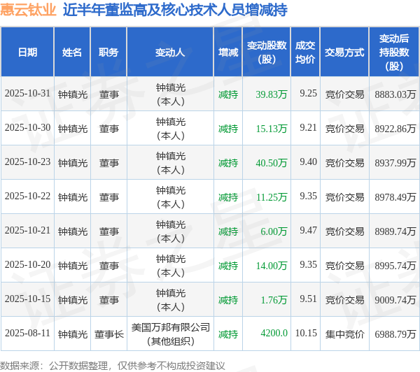惠云钛业近半年内的董监高及核心技术人员增减持详情如下: