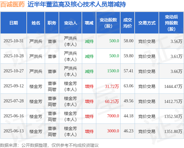 百诚医药近半年内的董监高及核心技术人员增减持详情如下: