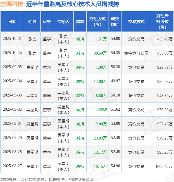崇德科技近半年内的董监高及核心技术人员增减持详情如下: