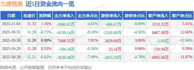 证券之星消息,截至2025年11月3日收盘,力源信息(300184)报收于11.33元,上涨1.16%,换手率4.98%,成交量52.2万手,成交额5.83亿元。