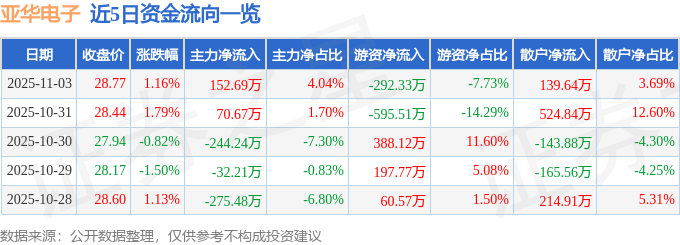 证券之星消息,截至2025年11月3日收盘,亚华电子(301337)报收于28.77元,上涨1.16%,换手率3.57%,成交量1.32万手,成交额3782.65万元。