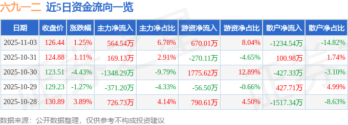证券之星消息,截至2025年11月3日收盘,六九一二(301592)报收于126.44元,上涨1.25%,换手率2.84%,成交量6643.0手,成交额8330.65万元。