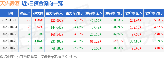 证券之星消息,截至2025年11月3日收盘,天佑德酒(002646)报收于9.72元,上涨1.36%,换手率0.88%,成交量4.19万手,成交额4049.12万元。