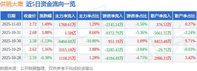 证券之星消息,截至2025年11月3日收盘,供销大集(000564)报收于2.72元,上涨1.49%,换手率3.45%,成交量507.17万手,成交额13.76亿元。