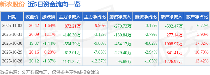 证券之星消息,截至2025年11月3日收盘,新农股份(002942)报收于20.42元,上涨1.64%,换手率3.17%,成交量4.35万手,成交额8814.06万元。