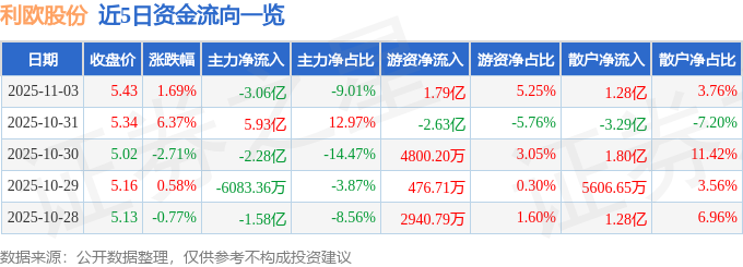 证券之星消息,截至2025年11月3日收盘,利欧股份(002131)报收于5.43元,上涨1.69%,换手率10.9%,成交量637.45万手,成交额34.02亿元。