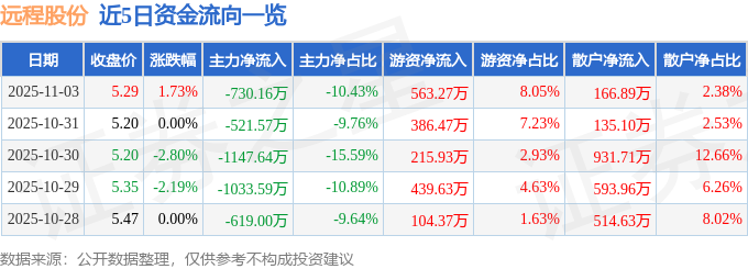 证券之星消息,截至2025年11月3日收盘,远程股份(002692)报收于5.29元,上涨1.73%,换手率1.85%,成交量13.29万手,成交额6997.89万元。