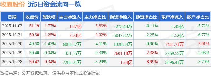 证券之星消息,截至2025年11月3日收盘,牧原股份(002714)报收于51.19元,上涨1.77%,换手率1.29%,成交量49.35万手,成交额25.27亿元。