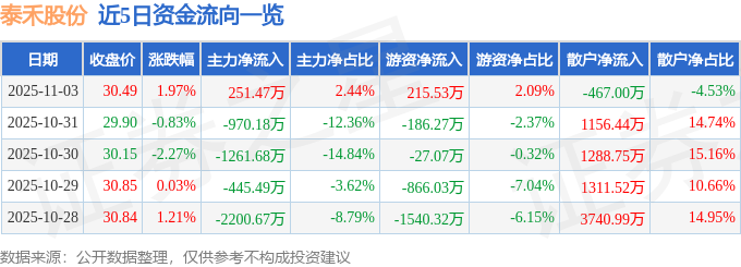 证券之星消息,截至2025年11月3日收盘,泰禾股份(301665)报收于30.49元,上涨1.97%,换手率8.85%,成交量3.38万手,成交额1.03亿元。