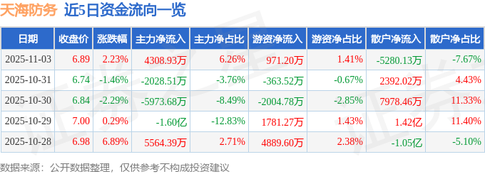 证券之星消息,截至2025年11月3日收盘,天海防务(300008)报收于6.89元,上涨2.23%,换手率6.11%,成交量100.62万手,成交额6.88亿元。