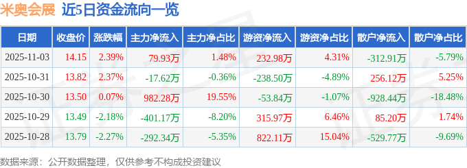 证券之星消息,截至2025年11月3日收盘,米奥会展(300795)报收于14.15元,上涨2.39%,换手率2.21%,成交量3.84万手,成交额5405.17万元。
