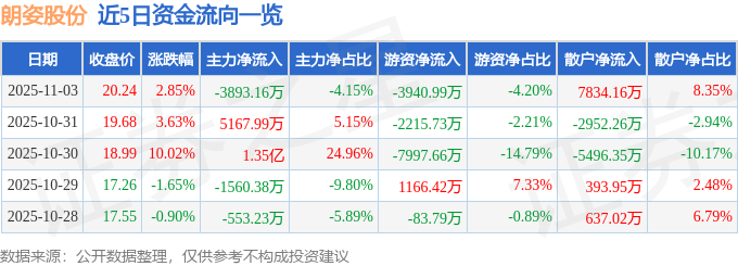 证券之星消息,截至2025年11月3日收盘,朗姿股份(002612)报收于20.24元,上涨2.85%,换手率18.3%,成交量46.61万手,成交额9.38亿元。