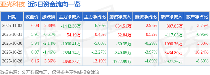 证券之星消息,截至2025年11月3日收盘,亚光科技(300123)报收于6.08元,上涨2.88%,换手率3.58%,成交量35.78万手,成交额2.15亿元。