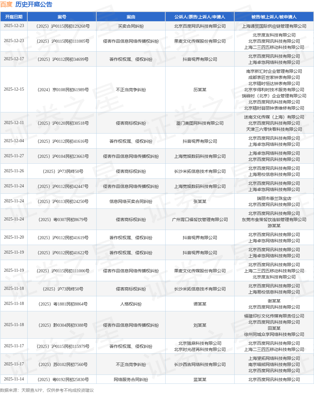 案号:(2025)浙0282民初11358号根据统计,近一年内以北京百度网讯科技有限公司为当事人的历史开庭公告有333则,其中案由为“侵害商标权纠纷”的公告以91则居首,其次为“侵害作品信息网络传播权纠纷”有61则,“不正当竞争纠纷”有55则。历史开庭公告(前20条)如下:
