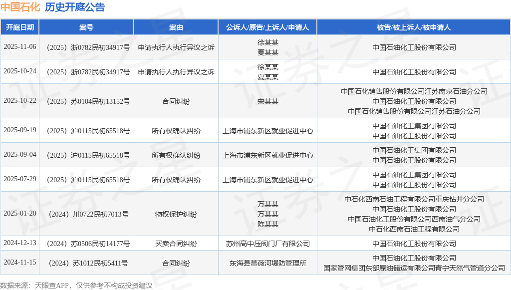 案号:(2025)浙0782民初34917号根据统计,近一年内以中国石油化工股份有限公司为当事人的历史开庭公告有9则,其中案由为“所有权确认纠纷”的公告以3则居首,其次为“合同纠纷”有2则,“申请执行人执行异议之诉”有2则。历史开庭公告如下:
