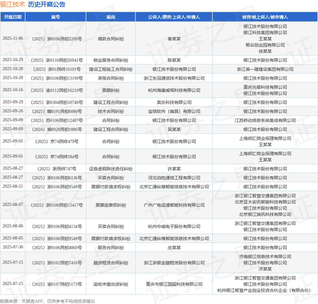 案号:(2025)浙0106民初2209号根据统计,近一年内以银江技术股份有限公司为当事人的历史开庭公告有91则,其中案由为“票据追索权纠纷”的公告以12则居首,其次为“合同纠纷”有12则,“劳动争议”有10则。历史开庭公告(前20条)如下: