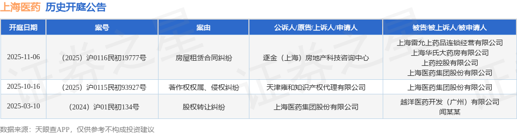 证券之星消息,根据天眼查APP显示,近日公布了一则上海医药集团股份有限公司作为被告/被上诉人的开庭公告,详细内容如下: