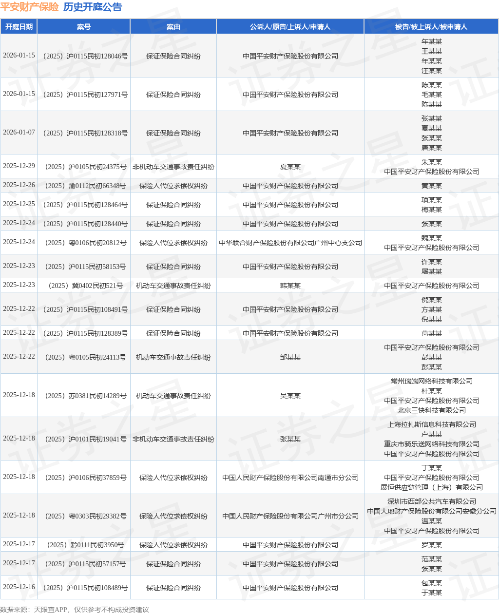 案号:(2025)沪0106民初18174号根据统计,近一年内以中国平安财产保险股份有限公司为当事人的历史开庭公告有2372则,其中案由为“机动车交通事故责任纠纷”的公告以1133则居首,其次为“保证保险合同纠纷”有296则,“保险人代位求偿权纠纷”有183则。历史开庭公告(前20条)如下: