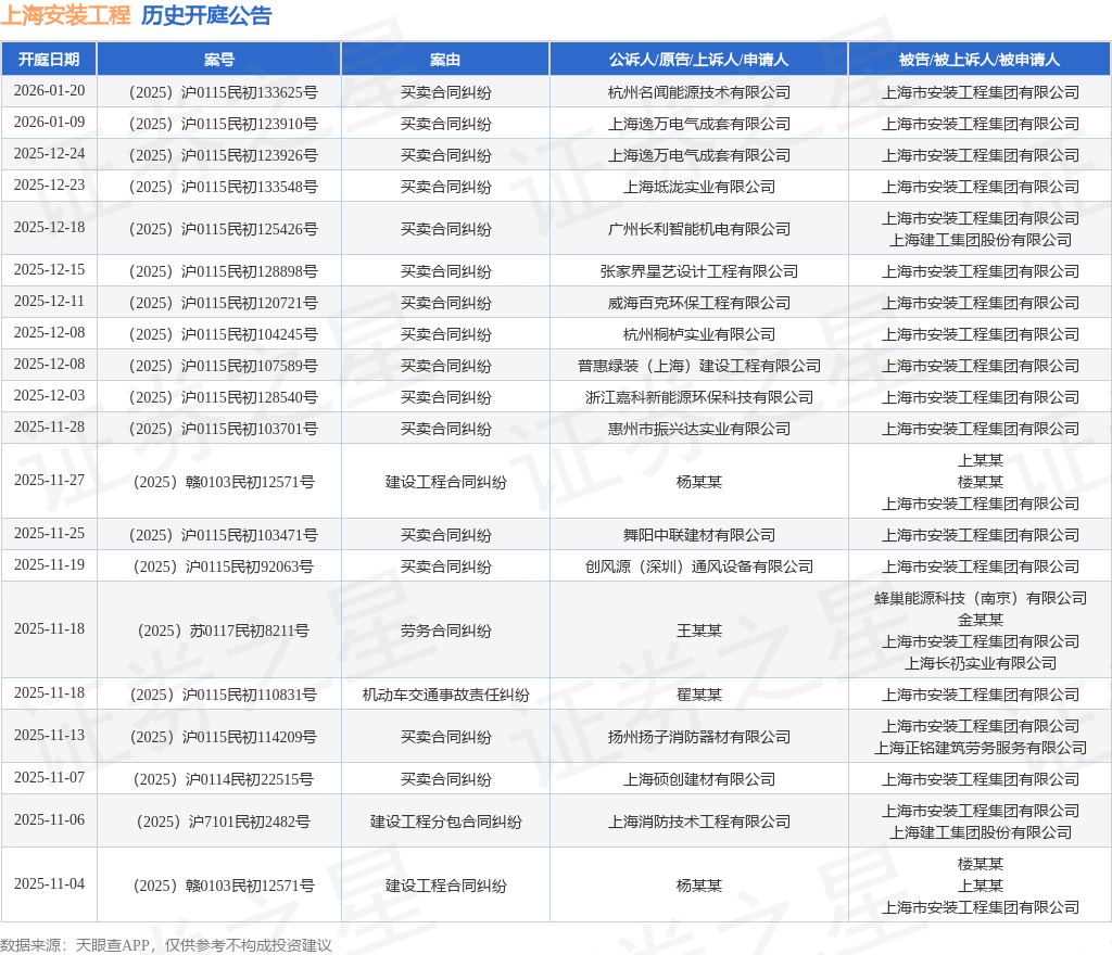 证券之星消息,根据天眼查APP显示,近日公布了一则上海市安装工程集团有限公司作为被告/被上诉人的开庭公告,详细内容如下: