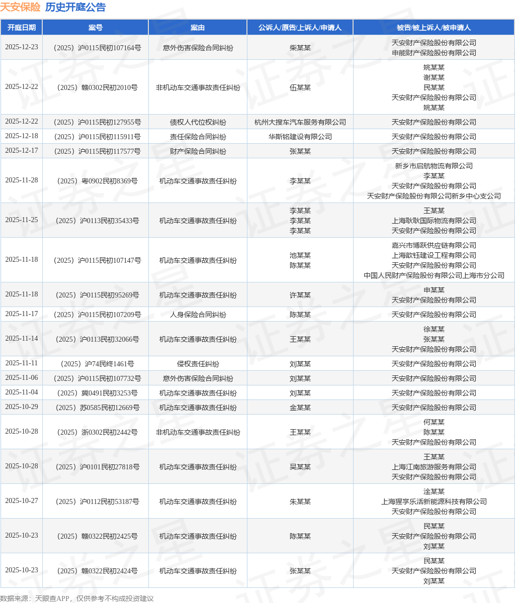 案号:(2025)沪0115民初107732号根据统计,近一年内以天安财产保险股份有限公司为当事人的历史开庭公告有477则,其中案由为“机动车交通事故责任纠纷”的公告以248则居首,其次为“财产保险合同纠纷”有54则,“人身保险合同纠纷”有28则。历史开庭公告(前20条)如下: