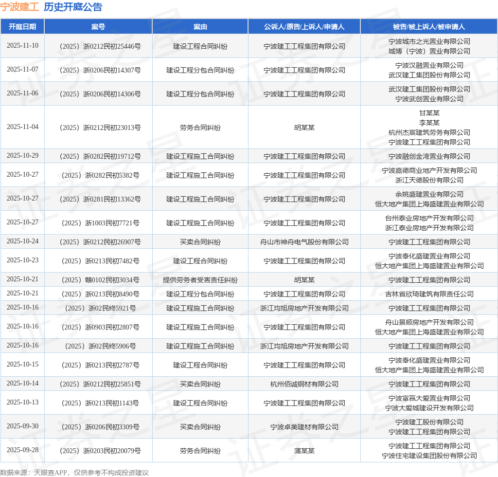 案号:(2025)浙0206民初14306号根据统计,近一年内以宁波建工工程集团有限公司为当事人的历史开庭公告有123则,其中案由为“买卖合同纠纷”的公告以29则居首,其次为“建设工程施工合同纠纷”有29则,“建设工程合同纠纷”有20则。历史开庭公告(前20条)如下:
