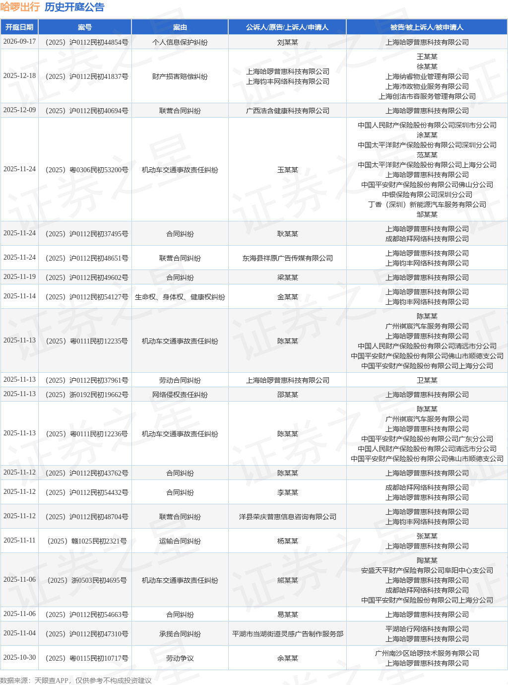 案号:(2025)浙0503民初4695号根据统计,近一年内以上海哈啰普惠科技有限公司为当事人的历史开庭公告有280则,其中案由为“机动车交通事故责任纠纷”的公告以77则居首,其次为“合同纠纷”有53则,“联营合同纠纷”有25则。历史开庭公告(前20条)如下: