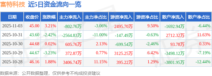 证券之星消息,截至2025年11月3日收盘,富特科技(301607)报收于45.0元,上涨3.21%,换手率5.43%,成交量5.88万手,成交额2.63亿元。