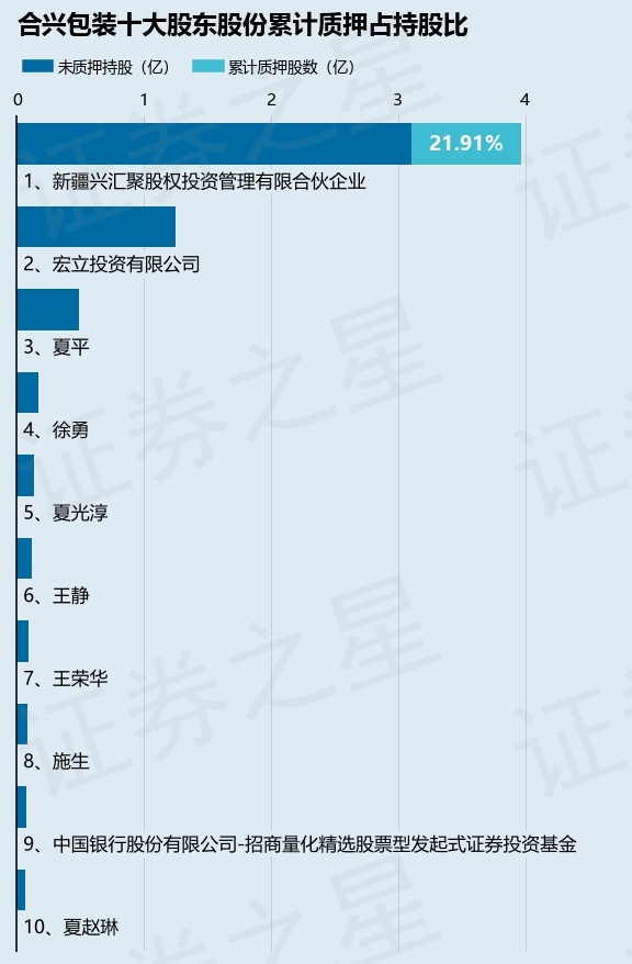 截止本公告日,股东新疆兴汇聚股权投资管理有限合伙企业已累计质押股份8701.0万股,占其持股总数的21.91%。本次质押后合兴包装十大股东的累计质押股份占持股比例(占持股比例的计算以公司最新一期财务报表公布的十大股东的持股总数为基准)见下图: