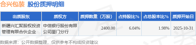 证券之星消息,合兴包装(002228)11月4日公开信息显示,股东新疆兴汇聚股权投资管理有限合伙企业向中信银行股份有限公司厦门分行合计质押2400.0万股,占总股本1.98%。质押详情见下表: