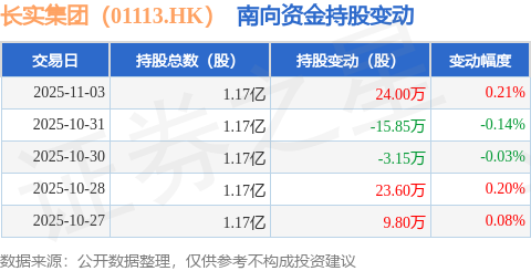 证券之星消息,11月3日南向资金增持24.0万股长实集团(01113.HK)。近5个交易日中,获南向资金增持的有3天,累计净增持38.4万股。近20个交易日中,获南向资金增持的有11天,累计净增持38.1万股。截至目前,南向资金持有长实集团(01113.HK)1.17亿股,占公司已发行普通股的3.34%。