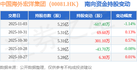 证券之星消息,11月3日南向资金减持607.4万股中国海外宏洋集团(00081.HK)。近5个交易日中,获南向资金减持的有2天,累计净减持274.1万股。近20个交易日中,获南向资金增持的有16天,累计净增持2421.81万股。截至目前,南向资金持有中国海外宏洋集团(00081.HK)5.25亿股,占公司已发行普通股的14.75%。
