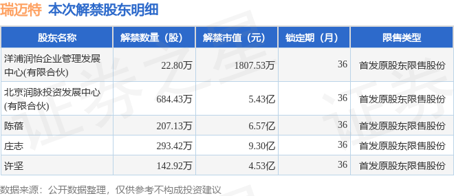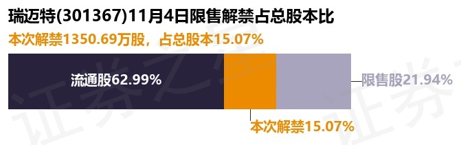 证券之星消息,根据市场公开信息整理,瑞迈特(301367)于11月4日将有1350.69万股限售股份解禁,为公司首发原股东限售股份,占公司总股本15.07%。(本次数据根据历史公告整理得出,实际情况以上市公司最新公告为准)本次解禁后,公司还有1965.64万股限售股份,占总股本21.94%。具体如下图所示: