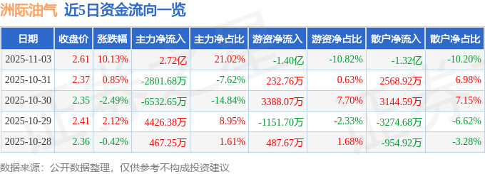 证券之星消息,截至2025年11月3日收盘,洲际油气(600759)报收于2.61元,上涨10.13%,涨停,换手率12.21%,成交量506.11万手,成交额12.93亿元。
