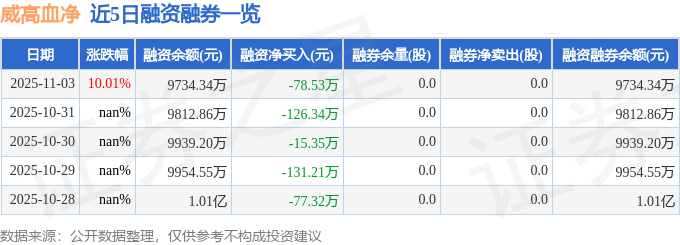 威高血净融资融券信息显示,融资方面,当日融资买入0.0万元,融资偿还78.53万元,融资净偿还78.53万元。融券方面,融券卖出0.0股,融券偿还0.0股,融券余量0.0股,融券余额0.0万元。融资融券余额9734.34万元。