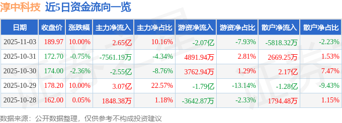 证券之星消息,截至2025年11月3日收盘,淳中科技(603516)报收于189.97元,上涨10.0%,涨停,换手率6.87%,成交量13.96万手,成交额26.11亿元。