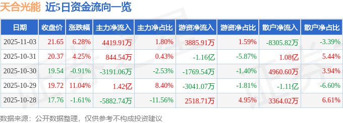 证券之星消息,截至2025年11月3日收盘,天合光能(688599)报收于21.65元,上涨6.28%,换手率5.22%,成交量113.65万手,成交额24.49亿元。
