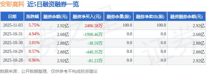 安彩高科融资融券信息显示,融资方面,当日融资买入6188.85万元,融资偿还3782.27万元,融资净买入2406.58万元。融券方面,融券卖出100.0股,融券偿还0.0股,融券余量100.0股,融券余额0.06万元。融资融券余额2.92亿元。
