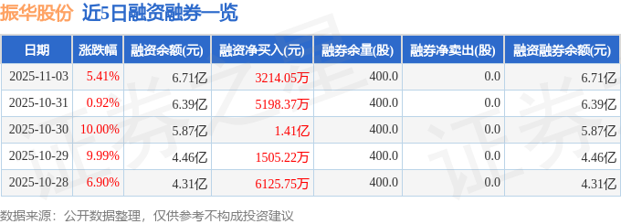 振华股份融资融券信息显示,融资方面,当日融资买入1.32亿元,融资偿还9986.91万元,融资净买入3214.05万元,连续3日净买入累计2.25亿元。融券方面,融券卖出0.0股,融券偿还0.0股,融券余量400.0股,融券余额1.02万元。融资融券余额6.71亿元。