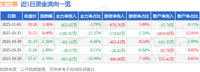 证券之星消息,截至2025年11月3日收盘,宝兰德(688058)报收于33.2元,上涨5.36%,换手率5.77%,成交量4.49万手,成交额1.48亿元。