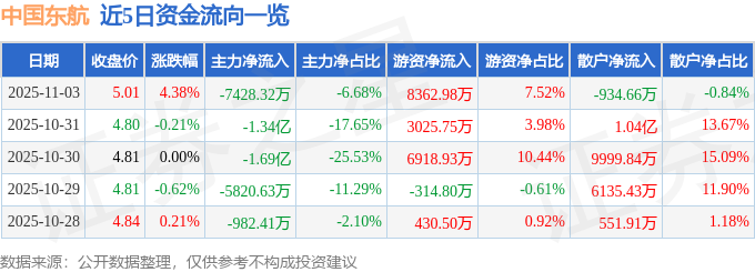 证券之星消息,截至2025年11月3日收盘,中国东航(600115)报收于5.01元,上涨4.38%,换手率1.32%,成交量225.13万手,成交额11.12亿元。