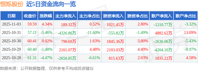 证券之星消息,截至2025年11月3日收盘,恒烁股份(688416)报收于59.59元,上涨4.34%,换手率9.75%,成交量6.36万手,成交额3.64亿元。
