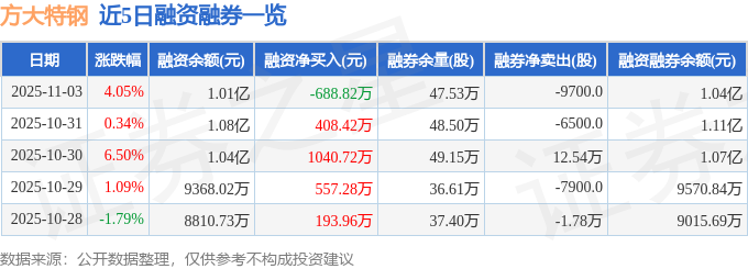 证券之星消息,截至2025年11月3日收盘,方大特钢(600507)报收于6.16元,上涨4.05%,换手率2.85%,成交量65.97万手,成交额4.01亿元。