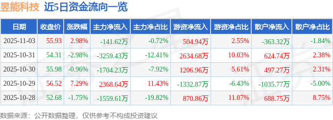 证券之星消息,截至2025年11月3日收盘,昱能科技(688348)报收于55.93元,上涨2.98%,换手率2.33%,成交量3.64万手,成交额1.98亿元。
