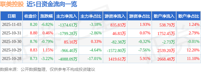 证券之星消息,截至2025年11月3日收盘,联美控股(600167)报收于8.2元,下跌6.82%,换手率2.36%,成交量53.3万手,成交额4.33亿元。