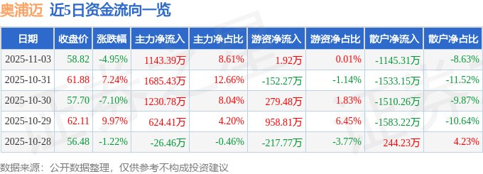 证券之星消息,截至2025年11月3日收盘,奥浦迈(688293)报收于58.82元,下跌4.95%,换手率1.98%,成交量2.25万手,成交额1.33亿元。