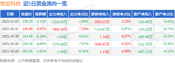 证券之星消息,截至2025年11月3日收盘,恒玄科技(688608)报收于238.29元,下跌3.13%,换手率2.03%,成交量3.42万手,成交额8.11亿元。