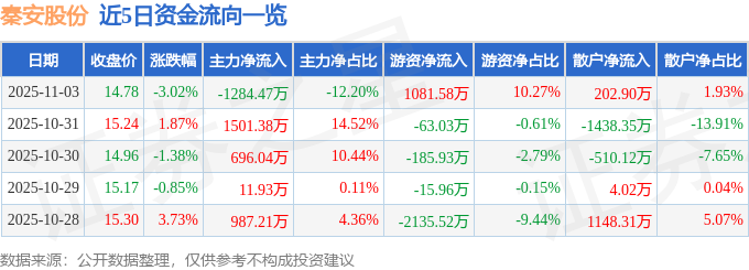证券之星消息,截至2025年11月3日收盘,秦安股份(603758)报收于14.78元,下跌3.02%,换手率1.62%,成交量7.12万手,成交额1.05亿元。