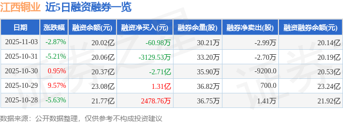 江西铜业融资融券信息显示,融资方面,当日融资买入2.86亿元,融资偿还2.87亿元,融资净偿还60.98万元。融券方面,融券卖出2.3万股,融券偿还5.29万股,融券余量30.21万股,融券余额1205.68万元。融资融券余额20.14亿元。